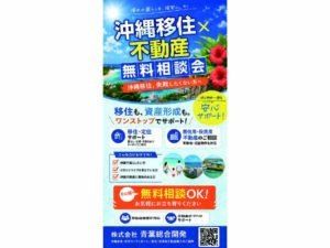 沖縄県那覇市の不動産会社、青葉総合開発と申します。沖縄移住・不動産投資・沖縄にお持ちの不動産売却や相続の無料相談会を開催いたします。沖縄の不動産に関することなら、何でもお気軽にご相談いただけるカジュアルなブースです。お気軽にいらしてください。なお、ご予約のお客様優先となりますためご予定がお決まりでしたら、当社サイトよりご連絡ください。