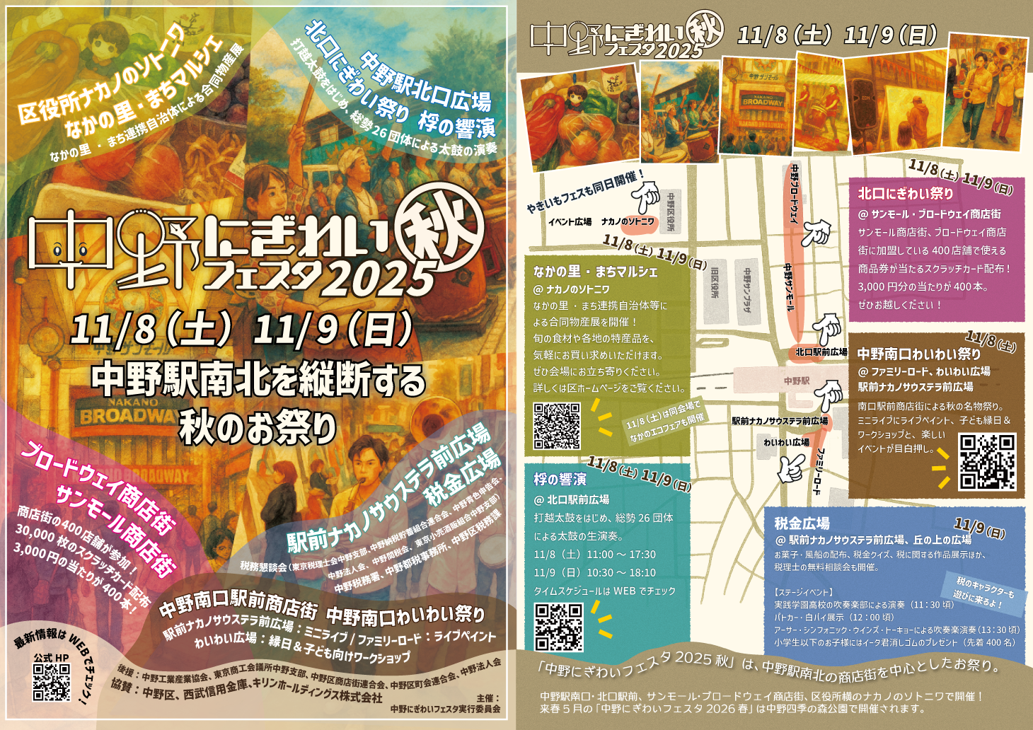 秋のにぎわいフェスタは、中野駅南口はサウステラ前とファミリーロード&わいわい広場(三菱UFJ銀行の裏)、北口駅前広場、サンモール&ブロードウェイ商店街、区役所横のナカノのソトニワで開催! カテゴリー: 2025秋
